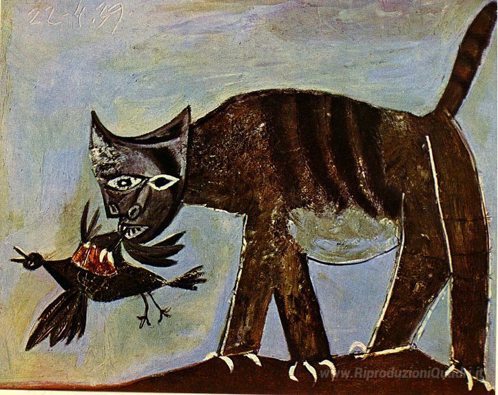 Ti offriamo una riproduzione artigianale su tela dell'opera famosa 'Gatto cattura un uccello' di Pablo Picasso, dal Museo delle Riproduzioni.