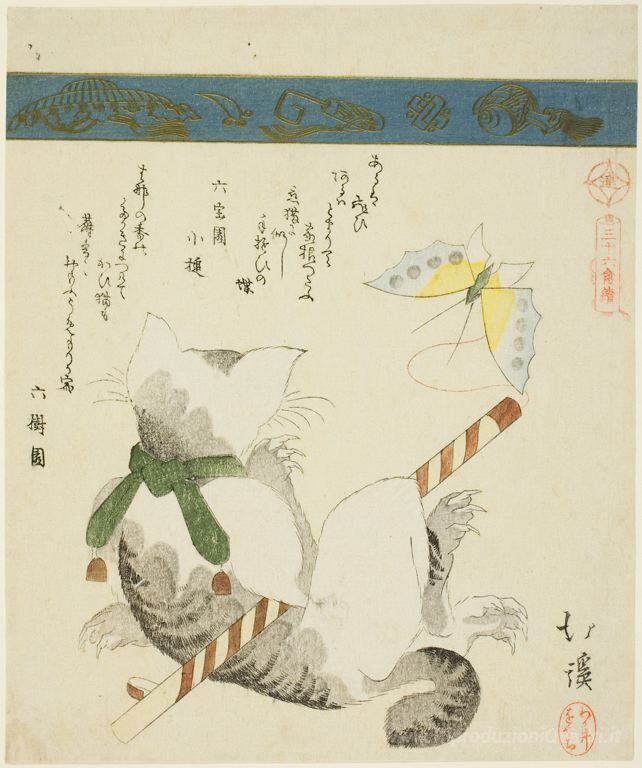 Ti offriamo una riproduzione artigianale su tela dell'opera famosa 'Gatto che gioca con un giocattolo farfalla' di Toyota Hokkei, dal Museo delle Riproduzioni.