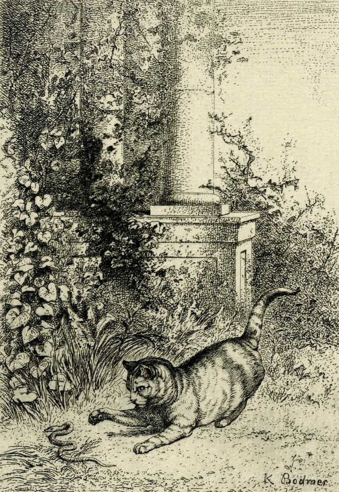 Ti offriamo una riproduzione artigianale su tela dell'opera famosa 'Gatto che gioca con una vipera' di Karl Bodmer, dal Museo delle Riproduzioni.