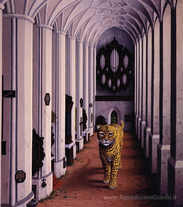 Ti offriamo una riproduzione artigianale su tela dell'opera famosa 'Gatto ecumenico' di Jacek Yerka, dal Museo delle Riproduzioni.