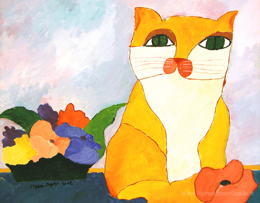 Ti offriamo una riproduzione artigianale su tela dell'opera famosa 'Gatto Giallo e fiori' di Aldemir Martins, dal Museo delle Riproduzioni.
