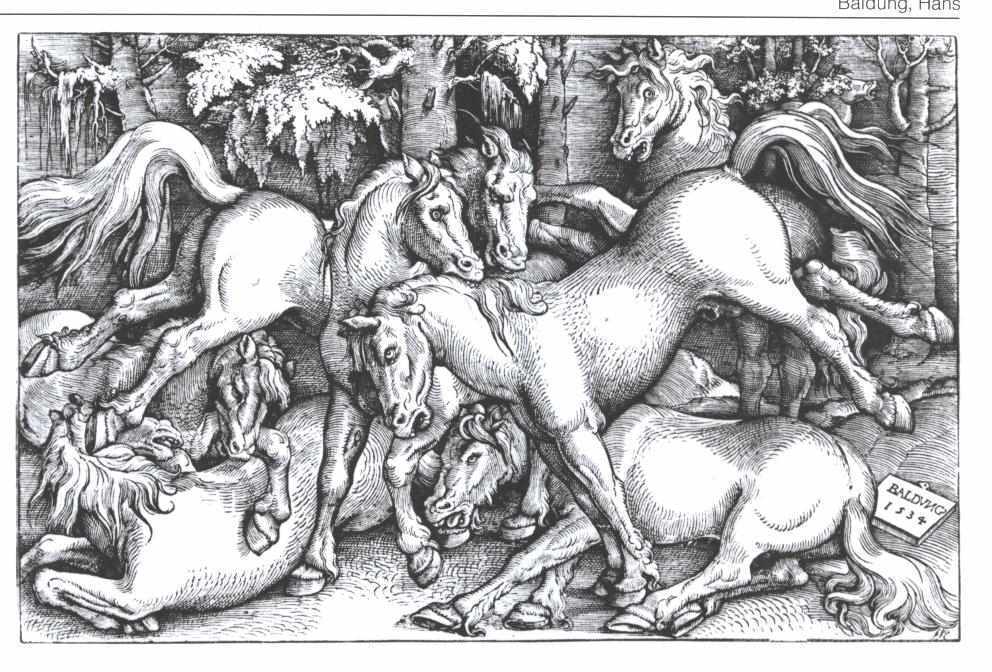 Ti offriamo una riproduzione artigianale su tela dell'opera famosa 'Gruppo dei Sette Wild Horses' di Hans Baldung, dal Museo delle Riproduzioni.