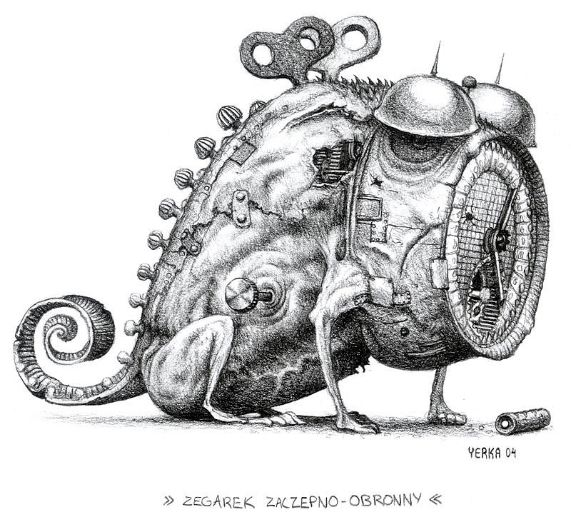 Ti offriamo una riproduzione artigianale su tela dell'opera famosa 'Guarda offensiva e difensiva' di Jacek Yerka, dal Museo delle Riproduzioni.