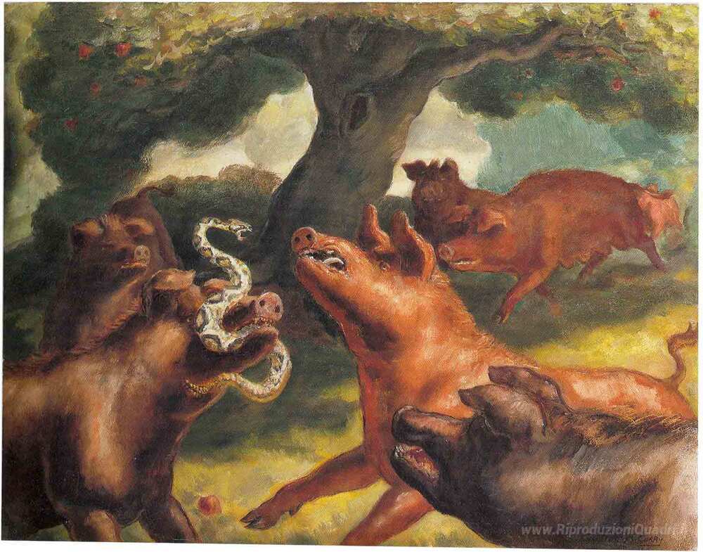 Ti offriamo una riproduzione artigianale su tela dell'opera famosa 'Hogs Uccidere un serpente' di John Steuart Curry, dal Museo delle Riproduzioni.