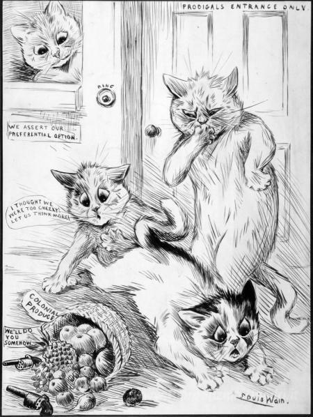 Ti offriamo una riproduzione artigianale su tela dell'opera famosa 'Il sbattuto PORTA' di Louis Wain, dal Museo delle Riproduzioni.