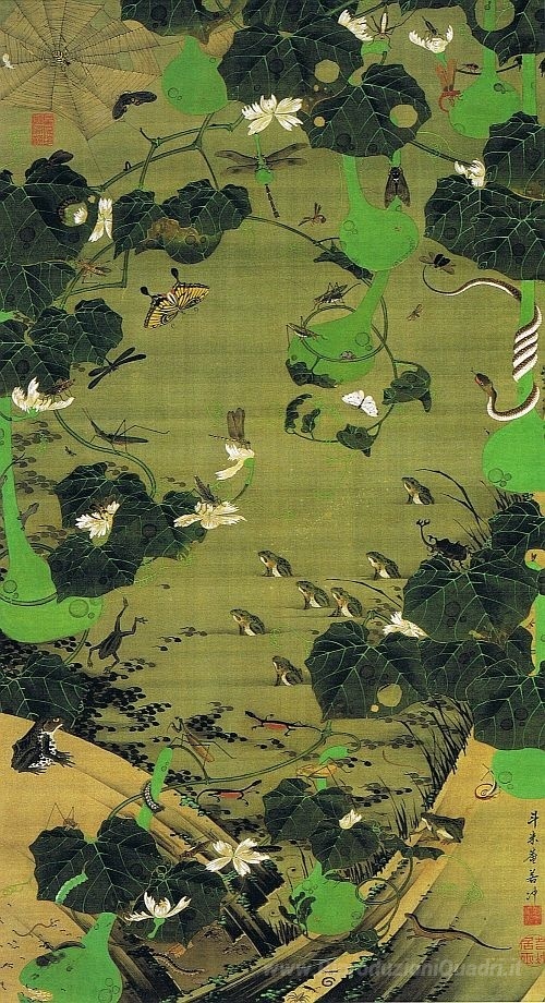 Ti offriamo una riproduzione artigianale su tela dell'opera famosa 'Insetti di Pond Side' di Ito Jakuchu, dal Museo delle Riproduzioni.