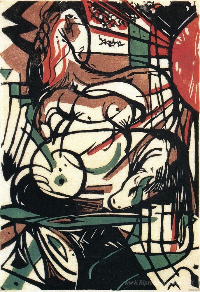 Ti offriamo una riproduzione artigianale su tela dell'opera famosa 'La nascita del Cavallo' di Franz Marc, dal Museo delle Riproduzioni.