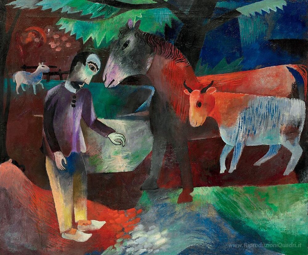 Ti offriamo una riproduzione artigianale su tela dell'opera famosa 'Mann, Pferd, Kuh' di Heinrich Campendonk, dal Museo delle Riproduzioni.
