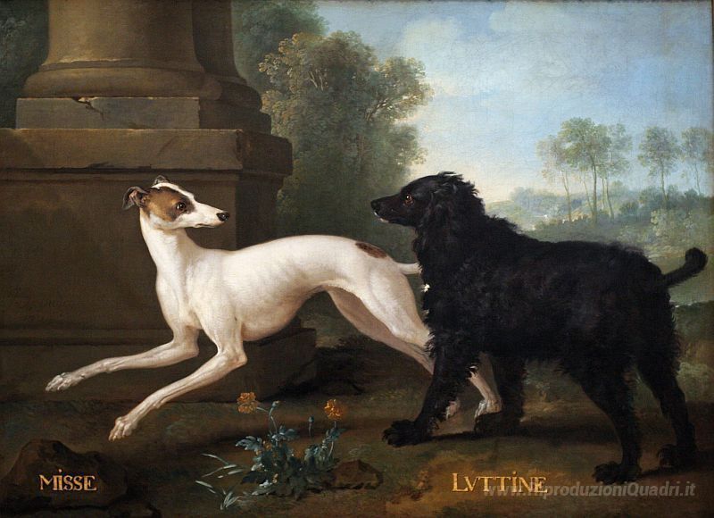 Ti offriamo una riproduzione artigianale su tela dell'opera famosa 'Missy e Luttine' di Jean-Baptiste Oudry, dal Museo delle Riproduzioni.