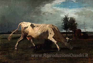 Ti offriamo una riproduzione artigianale su tela dell'opera famosa 'Mucca inseguito da un cane' di Constant Troyon, dal Museo delle Riproduzioni.