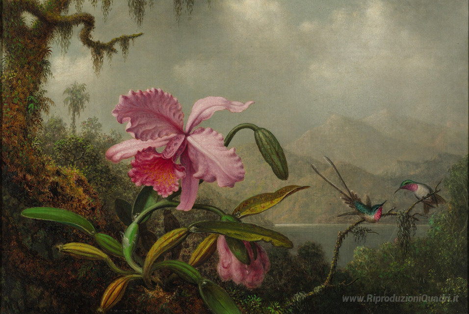 Ti offriamo una riproduzione artigianale su tela dell'opera famosa 'Orchidee e colibrì' di Martin Johnson Heade, dal Museo delle Riproduzioni.