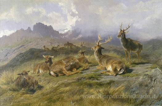 Ti offriamo una riproduzione artigianale su tela dell'opera famosa 'Paesaggio con Cervo' di Rosa Bonheur, dal Museo delle Riproduzioni.