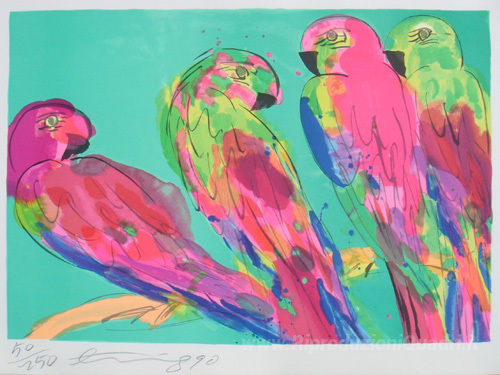 Ti offriamo una riproduzione artigianale su tela dell'opera famosa 'Pappagalli' di Walasse Ting, dal Museo delle Riproduzioni.