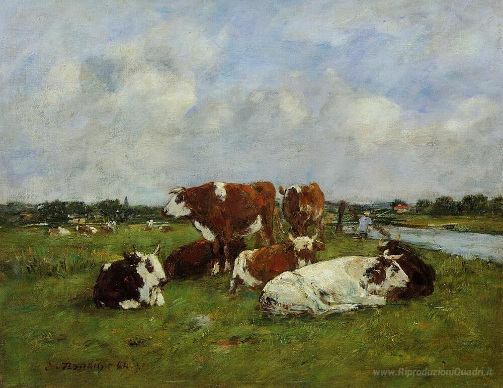 Ti offriamo una riproduzione artigianale su tela dell'opera famosa 'Pascoli sulle rive del Touques' di Eugene Boudin, dal Museo delle Riproduzioni.