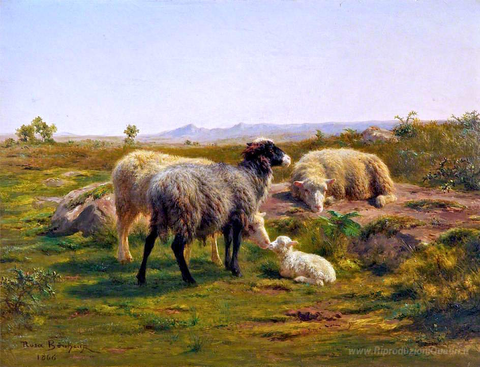 Scopri l'incanto del dipinto a olio Pecore e un Agnello, una straordinaria opera dell'illustre artista francese Rosa Bonheur. Nata nel 1822, Bonheur è conosciuta per il suo talento nell'immortalare la vita animale con un realismo dettagliato e una sensibilità unica. Questo capolavoro rappresenta un momento di tenerezza e vulnerabilità nel regno animale, catturando la bellezza della natura attraverso pennellate morbide e luminose.