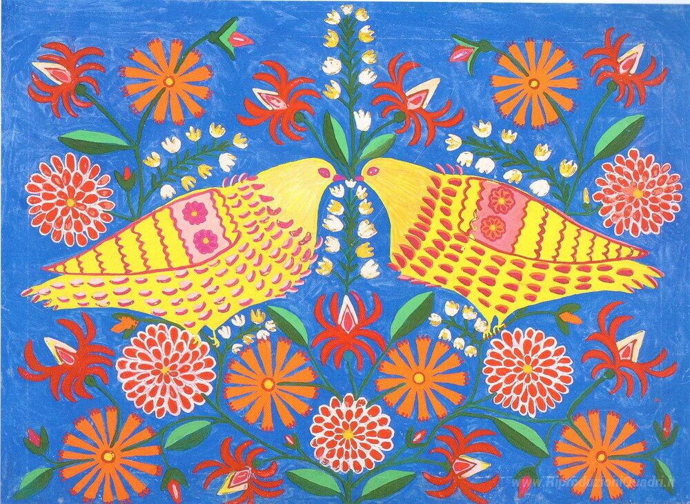 Ti offriamo una riproduzione artigianale su tela dell'opera famosa 'Piccioni' di Maria Primachenko, dal Museo delle Riproduzioni.