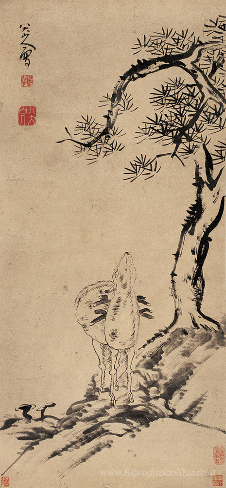 Ti offriamo una riproduzione artigianale su tela dell'opera famosa 'Pino e Deer' di Bada Shanren, dal Museo delle Riproduzioni.