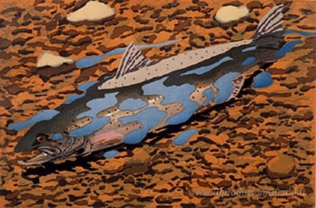 Ti offriamo una riproduzione artigianale su tela dell'opera famosa 'Redding Salmon' di Neil Welliver, dal Museo delle Riproduzioni.