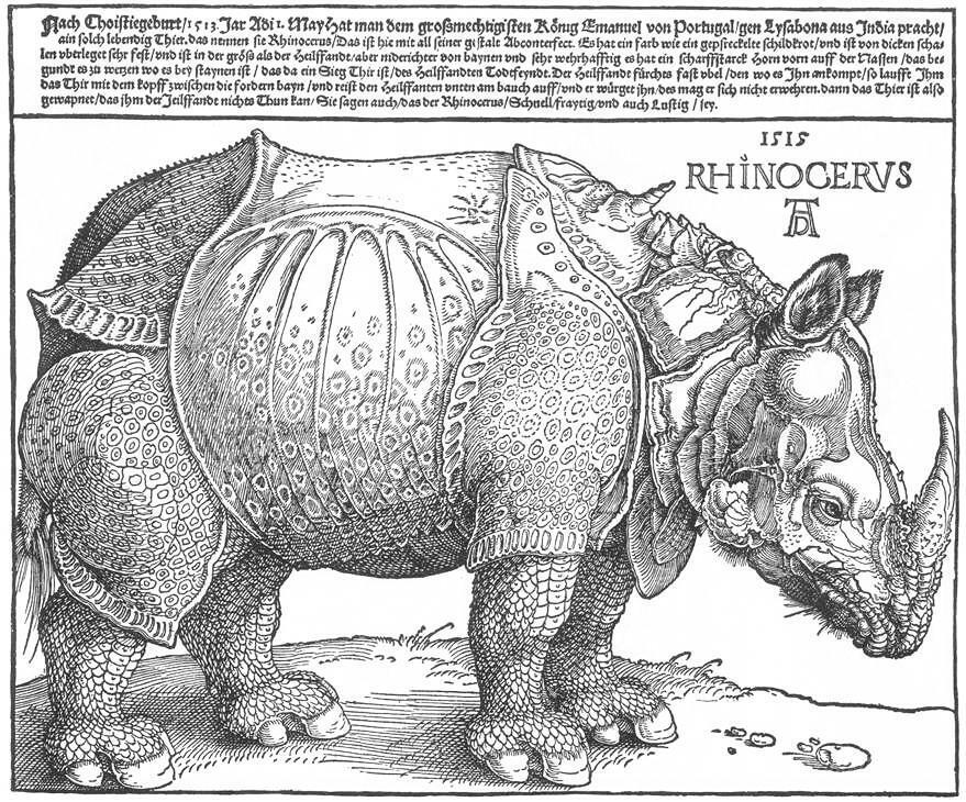 Ti offriamo una riproduzione artigianale su tela dell'opera famosa 'Rinoceronte' di Albrecht Durer, dal Museo delle Riproduzioni.