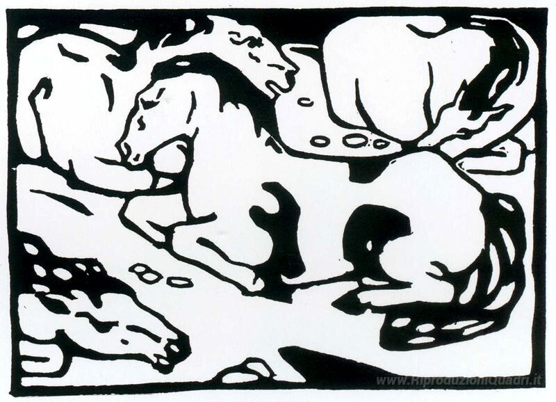 Ti offriamo una riproduzione artigianale su tela dell'opera famosa 'Riposo dei cavalli' di Franz Marc, dal Museo delle Riproduzioni.