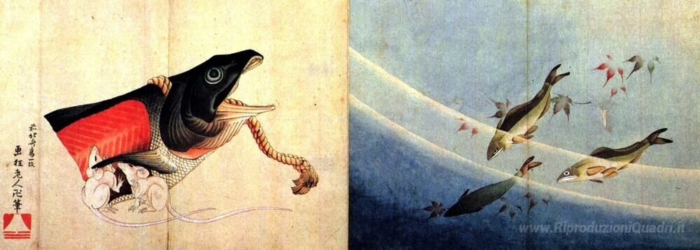 Ti offriamo una riproduzione artigianale su tela dell'opera famosa 'Salmond e topi salato' di Katsushika Hokusai, dal Museo delle Riproduzioni.