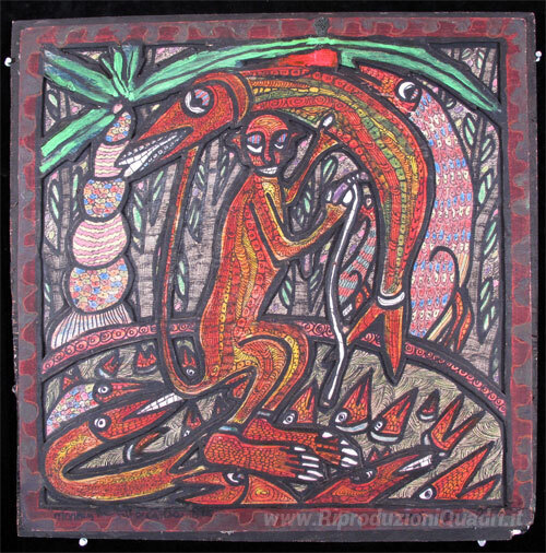 Ti offriamo una riproduzione artigianale su tela dell'opera famosa 'Scimmia con Pesce' di Twins Seven Seven, dal Museo delle Riproduzioni.