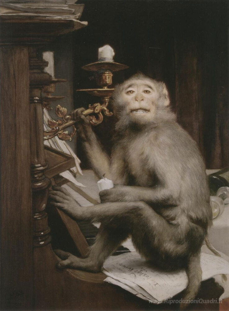 Ti offriamo una riproduzione artigianale su tela dell'opera famosa 'Scimmie al pianoforte' di Gabriel von Max, dal Museo delle Riproduzioni.
