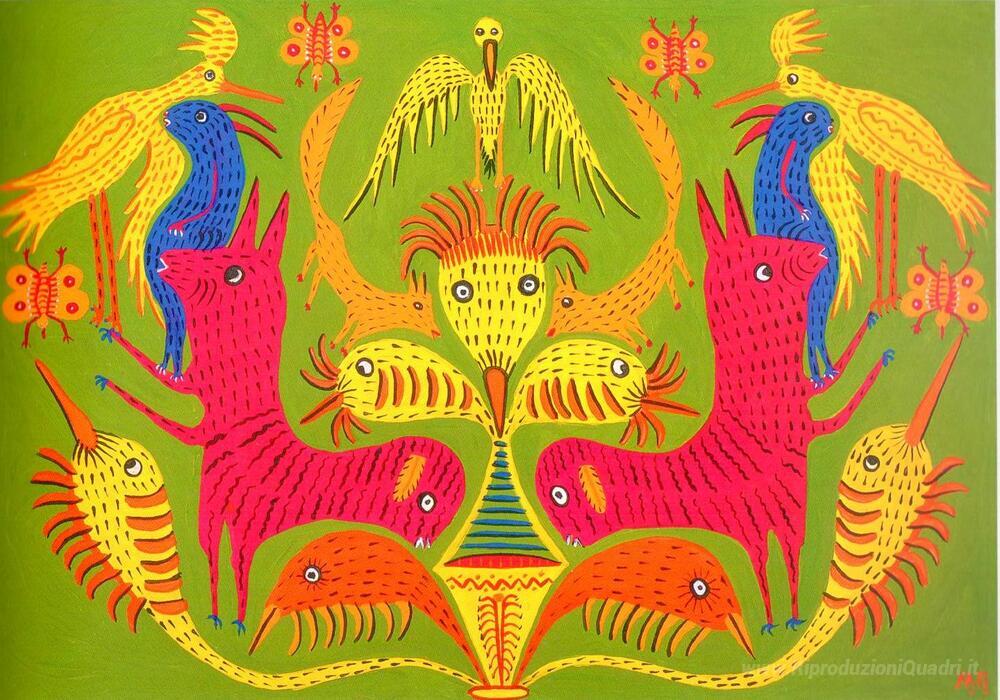 Ti offriamo una riproduzione artigianale su tela dell'opera famosa 'Serraglio' di Maria Primachenko, dal Museo delle Riproduzioni.