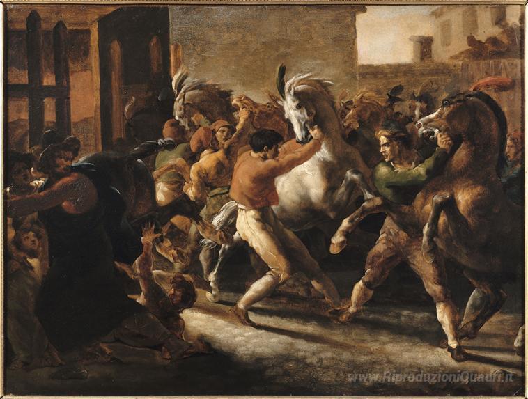 Ti offriamo una riproduzione artigianale su tela dell'opera famosa 'Studio per la corsa dei Cavalli barbariche' di Theodore Gericault, dal Museo delle Riproduzioni.