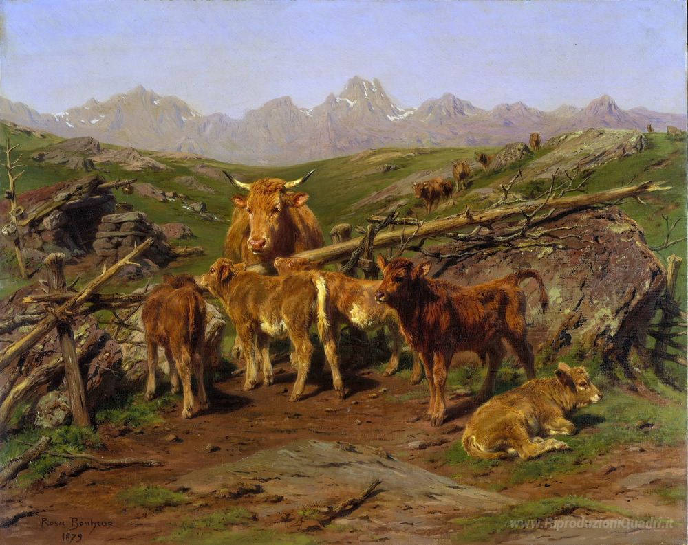 Ti offriamo una riproduzione artigianale su tela dell'opera famosa 'Svezzamento Vitelli' di Rosa Bonheur, dal Museo delle Riproduzioni.