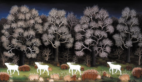 Ti offriamo una riproduzione artigianale su tela dell'opera famosa 'The Wedding Cervo' di Ivan Generalic, dal Museo delle Riproduzioni.