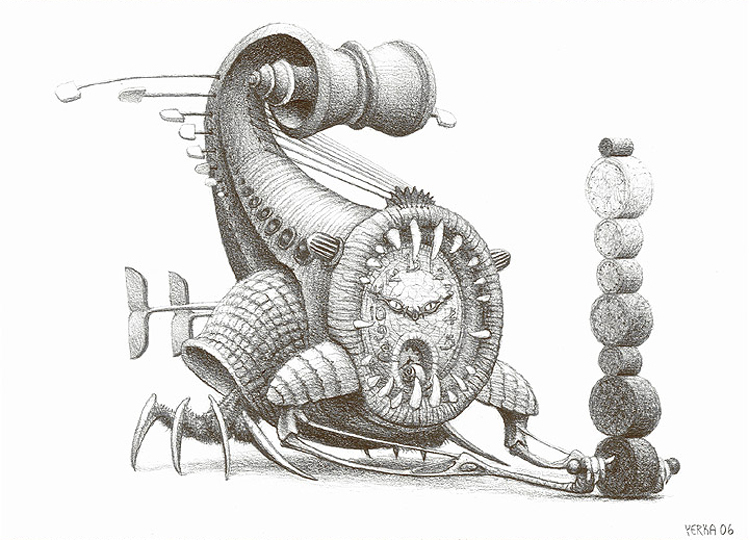 Ti offriamo una riproduzione artigianale su tela dell'opera famosa 'Tuner tempo' di Jacek Yerka, dal Museo delle Riproduzioni.