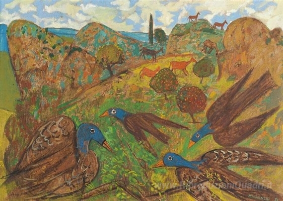 Ti offriamo una riproduzione artigianale su tela dell'opera famosa 'Uccelli' di Grégoire Michonze, dal Museo delle Riproduzioni.