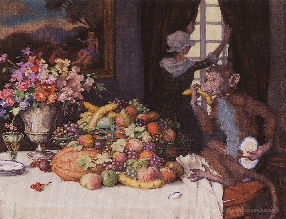 Ti offriamo una riproduzione artigianale su tela dell'opera famosa 'Una Scimmia Greedy' di Konstantin Somov, dal Museo delle Riproduzioni.