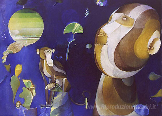 Ti offriamo una riproduzione artigianale su tela dell'opera famosa 'Uomo e la scimmia' di Stanley Pinker, dal Museo delle Riproduzioni.