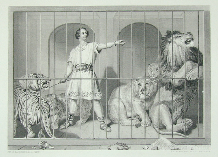 Ti offriamo una riproduzione artigianale su tela dell'opera famosa 'Van Amburgh ei suoi grandi felini gioco' di Edwin Henry Landseer, dal Museo delle Riproduzioni.