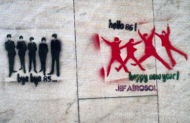 Ti offriamo una riproduzione artigianale su tela dell'opera famosa 'Auguri di Capodanno' di Jef Aerosol, dal Museo delle Riproduzioni.