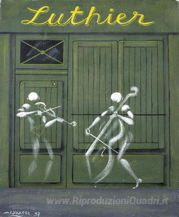 Ti offriamo una riproduzione artigianale su tela dell'opera famosa 'Liutaio' di Jerome Mesnager, dal Museo delle Riproduzioni.