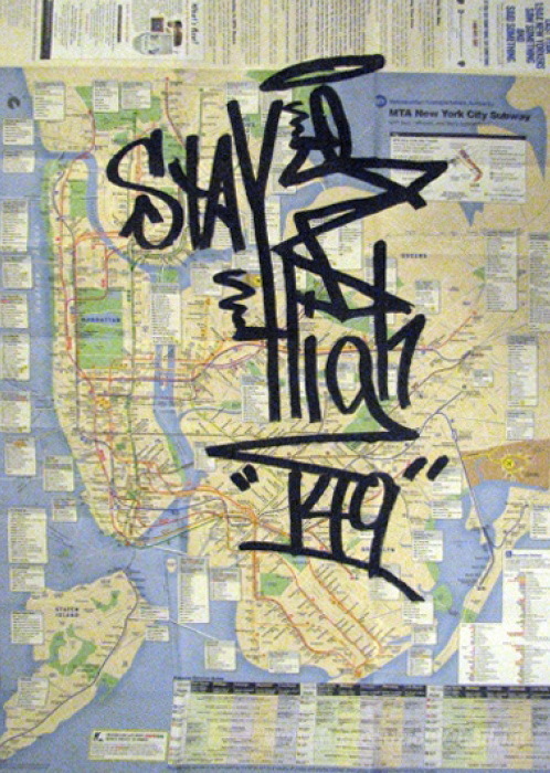 Ti offriamo una riproduzione artigianale su tela dell'opera famosa 'Mappa' di Stay High 149, dal Museo delle Riproduzioni.