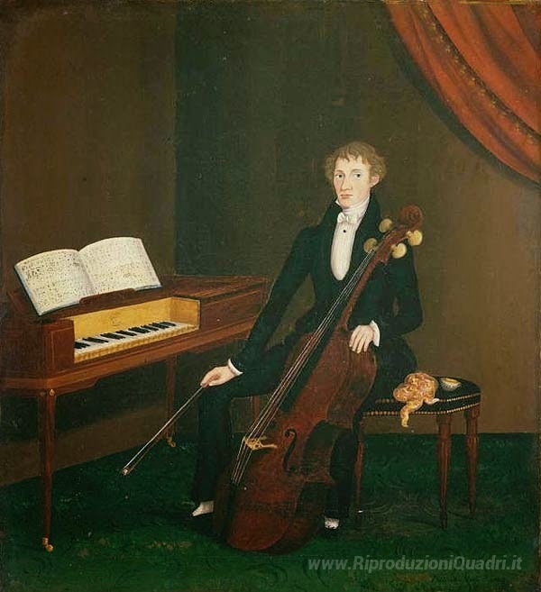 Ti offriamo una riproduzione artigianale su tela dell'opera famosa 'Il violoncellista' di John Bradley, dal Museo delle Riproduzioni.