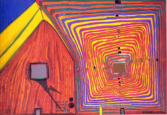 Ti offriamo una riproduzione artigianale su tela dell'opera famosa '551a Spiralsun e Moonhouse - The Neighbours' di Friedensreich Hundertwasser, dal Museo delle Riproduzioni.