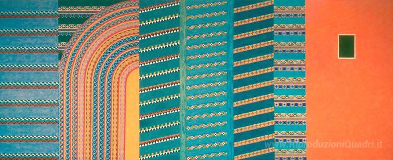 Ti offriamo una riproduzione artigianale su tela dell'opera famosa 'Cattedrale a righe' di Joyce Kozloff, dal Museo delle Riproduzioni.