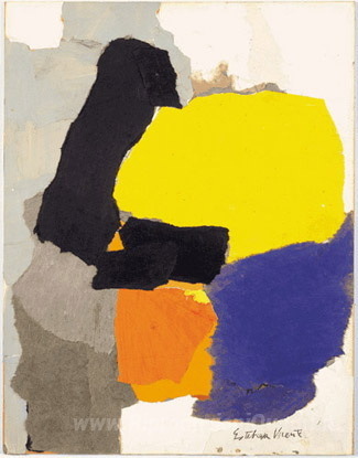 Ti offriamo una riproduzione artigianale su tela dell'opera famosa 'Collage con giallo, blu e arancione' di Esteban Vicente, dal Museo delle Riproduzioni.