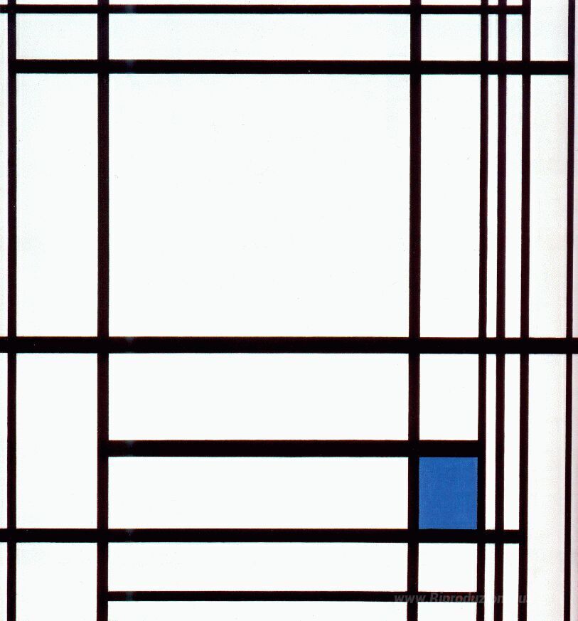 Ti offriamo una riproduzione artigianale su tela dell'opera famosa 'Composizione con blu' di Piet Mondrian, dal Museo delle Riproduzioni.