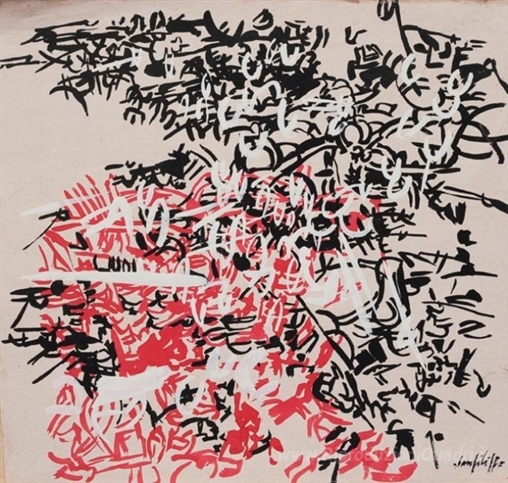 Ti offriamo una riproduzione artigianale su tela dell'opera famosa 'Composizione' di Antonio Sanfilippo, dal Museo delle Riproduzioni.