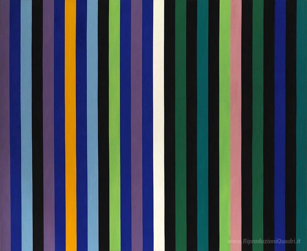 Ti offriamo una riproduzione artigianale su tela dell'opera famosa 'Due Blu Parte' di Gene Davis, dal Museo delle Riproduzioni.