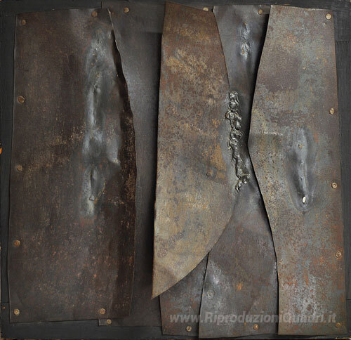 Ti offriamo una riproduzione artigianale su tela dell'opera famosa 'Ferro' di Alberto Burri, dal Museo delle Riproduzioni.