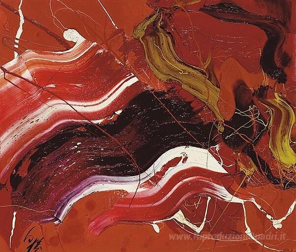 Ti offriamo una riproduzione artigianale su tela dell'opera famosa 'Fluido Rosso' di Kazuo Shiraga, dal Museo delle Riproduzioni.