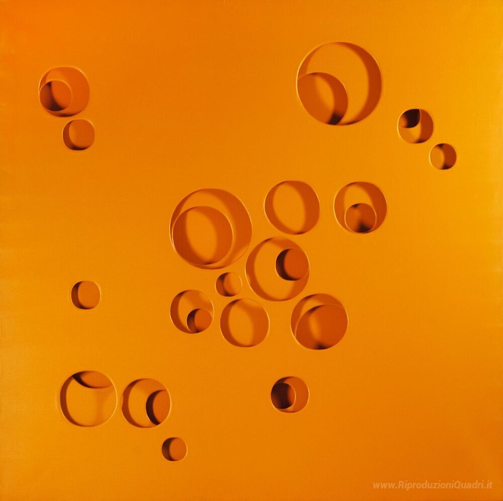 Ti offriamo una riproduzione artigianale su tela dell'opera famosa 'Intersuperficie Curva Arancio' di Paolo Scheggi, dal Museo delle Riproduzioni.