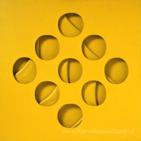 Ti offriamo una riproduzione artigianale su tela dell'opera famosa 'Intersuperficie curva gialla' di Paolo Scheggi, dal Museo delle Riproduzioni.